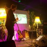 The Invisible Wind Factory had an interesting start with The AV Society’s short and theatrically interesting set. Stepping in a black suit on a stage with a projector screen, potted plants and furniture resembling a living room, our artist laid guitars and singing on top of pre-recorded sounds synced with a movie being played on the screen.
