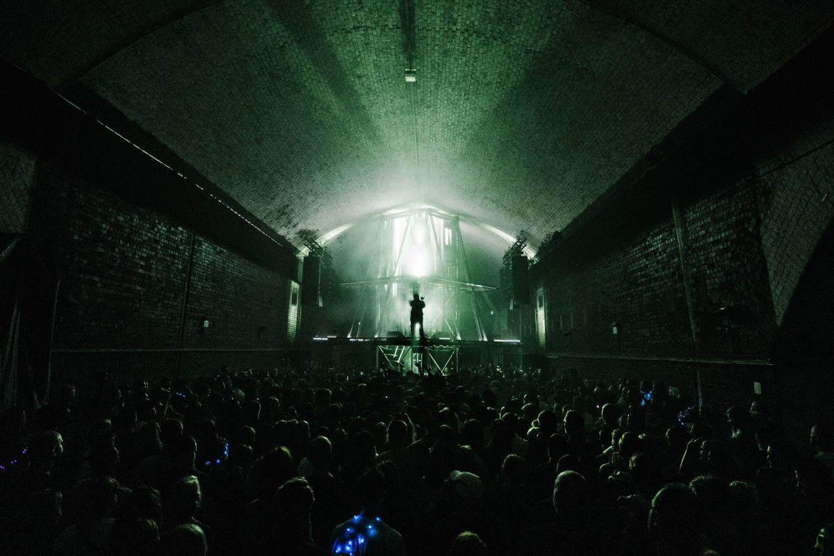A long tunneling warehouse with bass pulsating, strobes flashing and lasers guiding themselves around the narrow chasm.